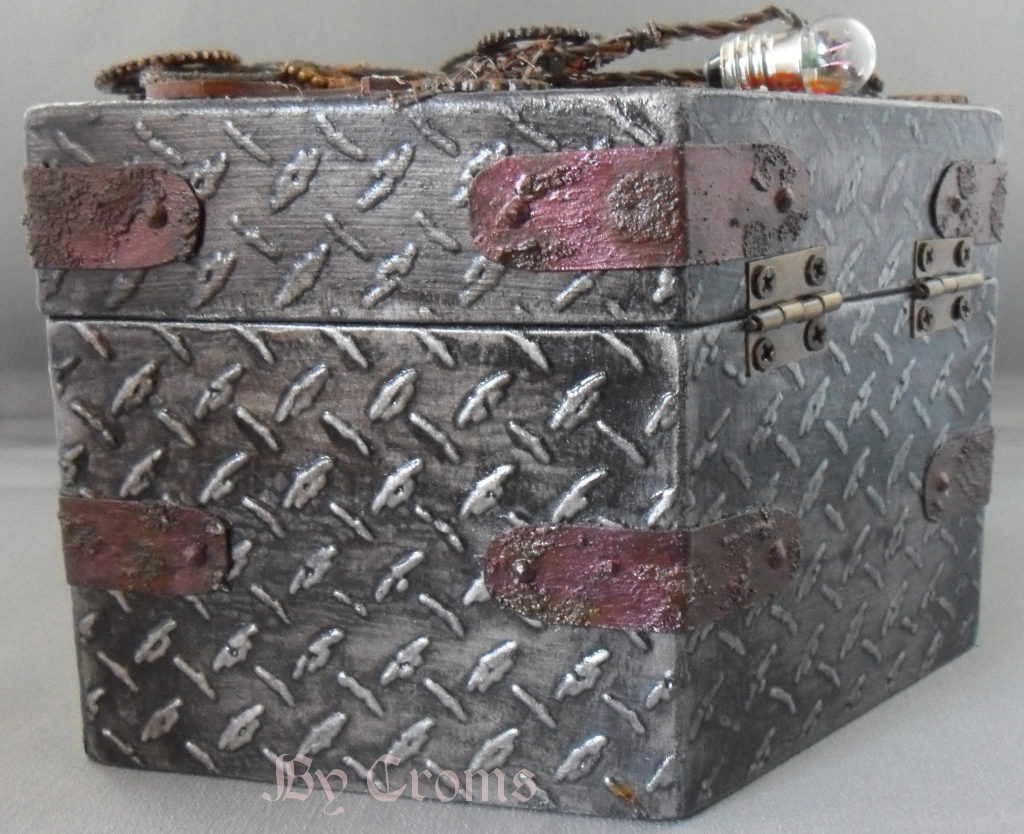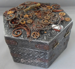 The base unit on my piece is made from a coffin shaped MDF box from stash and a resin face. Covered with fabrics coated with powertex and varnished with pigments.